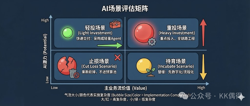 不再用Demo当预算基准,把数据、精度、集成、流程、培训、Token等隐性成本都算进去,并让老板和关键干系人对这些有清醒的认识。 - 2.投资瞄准主业务流
