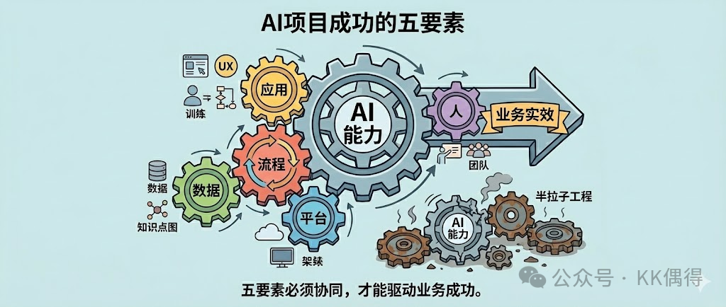 很多AI项目之所以半拉子,是因为只盯着AI技术和功能本身,没有足够重视数据、平台、流程和人的投入。以X企业为例,过去2年的很多AI项目场景是主业务流的,比如销售助手,但依然是半拉子工程,其核心原因是:这个项目是由科技发起的,投入都在AI技术上——“工程架构优化、调模型”,从一开始就没有业务深度介入,也没有考虑到业务人员的端到端体验,没有设身处地按业务人员视角用新的助手跑过业务流程,一味认为就是“业务人员僵化,不拥抱 AI”,但其实复盘下来,会发现站在业务视角,现在这个助手“的确很难用”。