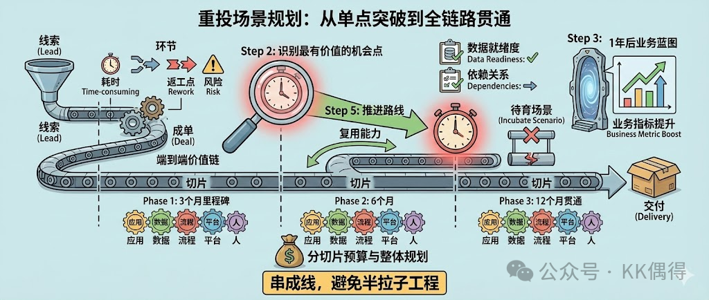 重投场景的规划,从一个可控切片入手,沿着主业务流逐步击穿,最终贯通成线;在预算上,同时设计好每个切片的投入和整条链的总盘子,每个里程碑及时复盘调整,避免半拉子工程。